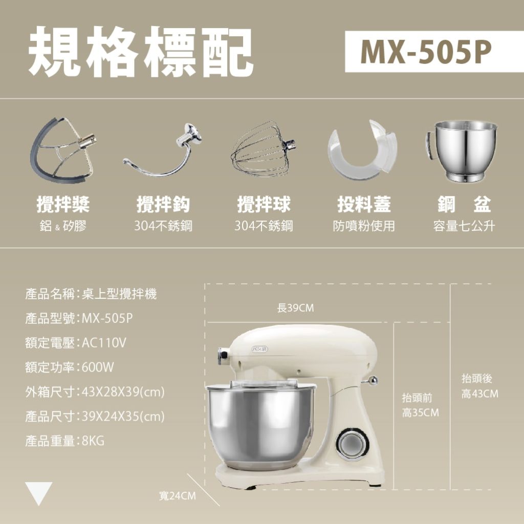 標配:攪拌球x1、攪拌鉤x1、攪拌槳x1、鋼盆x1、投料蓋x1